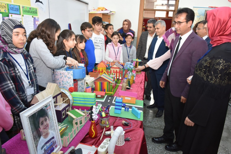 Öğrenciler, sergiyi ziyaret eden İl Milli Eğitim Müdürü Mehmet Çalışkan ve misafirlere, geri dönüşüm konusunda oluşturdukları projelerin sunumunu yaparken Muammer Mert'in projesi hakkında da bilgiler aktardılar.