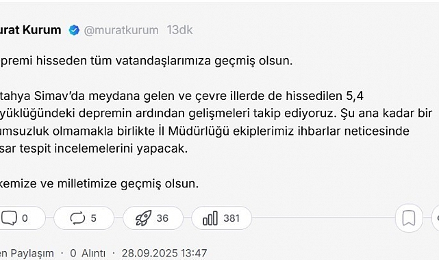 Çevre, Şehircilik ve İklim Değişikliği Bakanı Murat Kurum, sosyal medya hesabında yaptığı paylaşımda, "Depremi hisseden tüm vatandaşlarımıza geçmiş olsun" dedi. Çevre, Şehircilik ve İklim Değişikliği Bakanı Murat Kurum, Kütahya Simav'da meydana gelen 5,4 büyüklüğündeki deprem hakkında sosyal medya hesabında yaptığı paylaşımda şu ifadelere yer verdi: "Depremi hisseden tüm vatandaşlarımıza geçmiş olsun. Kütahya Simav'da meydana gelen ve çevre illerde de hissedilen 5,4 büyüklüğündeki depremin ardından gelişmeleri takip ediyoruz. Şu ana kadar bir olumsuzluk olmamakla birlikte İl Müdürlüğü ekiplerimiz ihbarlar neticesinde hasar tespit incelemelerini yapacak. Ülkemize ve milletimize geçmiş olsun."