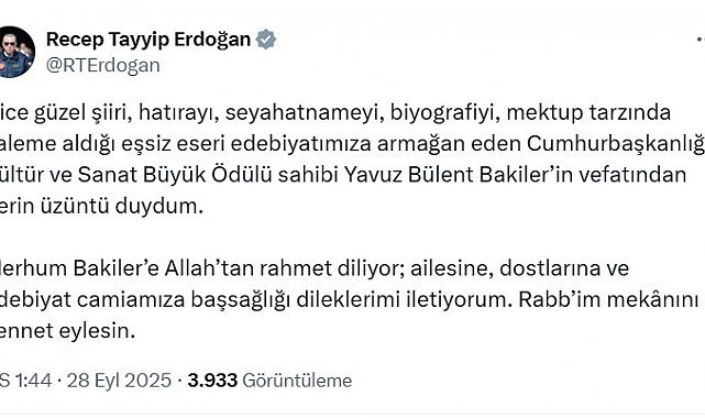 Cumhurbaşkanı Recep Tayyip Erdoğan, Cumhurbaşkanlığı Kültür ve Sanat Büyük Ödülü sahibi Yavuz Bülent Bakiler'in vefatına ilişkin başsağlığı mesajı yayımladı. Cumhurbaşkanı Recep Tayyip Erdoğan sosyal medya hesabından yaptığı paylaşımda, Cumhurbaşkanlığı Kültür ve Sanat Büyük Ödülü sahibi Yavuz Bülent Bakiler'in vefatına ilişkin başsağlığı mesajı yayımladı. Cumhurbaşkanı Erdoğan paylaşımında şu ifadelere yer verdi: "Nice güzel şiiri, hatırayı, seyahatnameyi, biyografiyi, mektup tarzında kaleme aldığı eşsiz eseri edebiyatımıza armağan eden Cumhurbaşkanlığı Kültür ve Sanat Büyük Ödülü sahibi Yavuz Bülent Bakiler'in vefatından derin üzüntü duydum. Merhum Bakiler'e Allah'tan rahmet diliyor; ailesine, dostlarına ve edebiyat camiamıza başsağlığı dileklerimi iletiyorum. Rabb'im mekanını cennet eylesin."