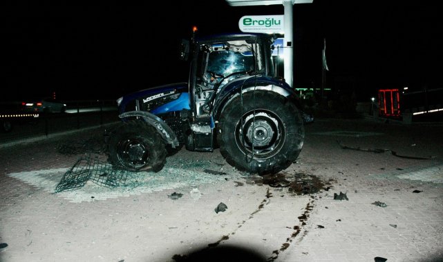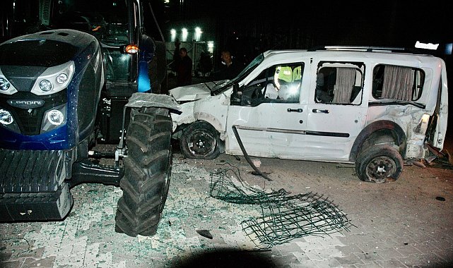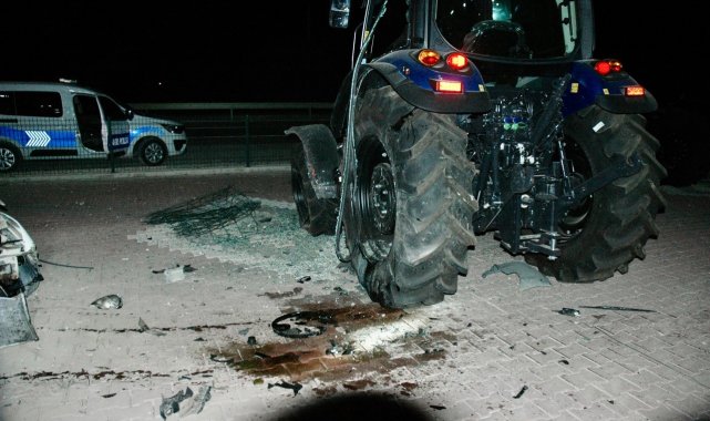 Kontrolden çıkan hafif ticari aracın satılmak üzere iş yerinde bulunan traktöre çarpması saniye saniye iş yerinin güvenlik kamerasına yansıdı.