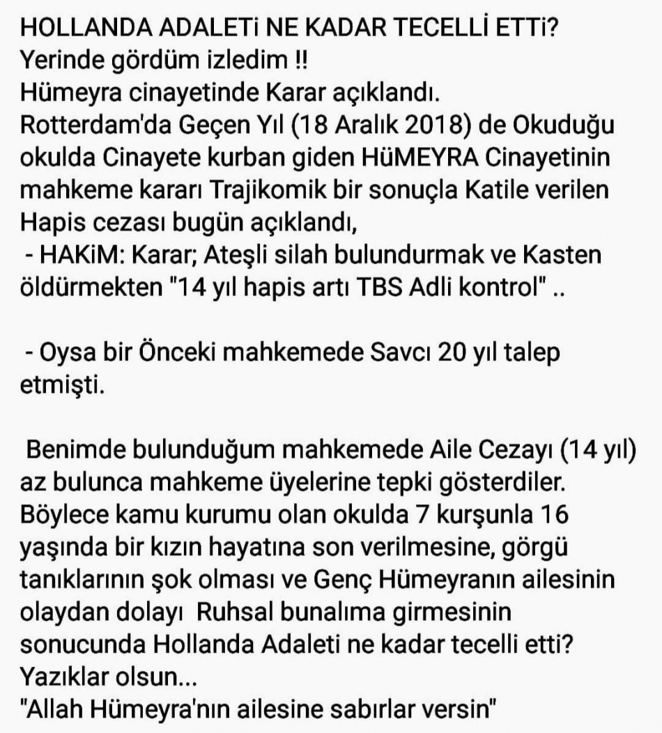 Olay geçtiğimiz 18 Aralık 2018'de Hümeyra Ergincanlı (16), Hollanda'nın Rotterdam şehrinde Bekir Eraslan tarafından okuduğu okulun bahçesinde silahlı saldırıya uğradı. Bekir E. tarafından silahla vurularak öldürülmüştü. Hümeyra'nın olay sırasında yere düştüğü, ona baktığı sırada ve bir metre öteden uzaktan kafasına ve vücuduna dört kurşun isabet aldığı öğrenildi.