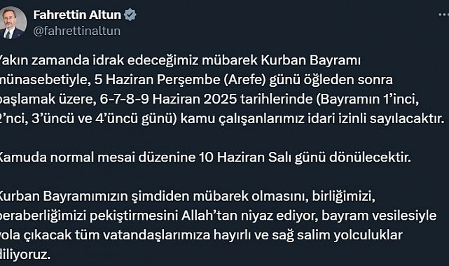 İletişim Başkanı Fahrettin Altun, "Yakın zamanda idrak edeceğimiz mübarek Kurban Bayramı münasebetiyle 5 Haziran Perşembe (Arefe) günü öğleden sonra başlamak üzere, 6-7-8-9 Haziran 2025 tarihlerinde kamu çalışanlarımız idari izinli sayılacaktır" dedi.