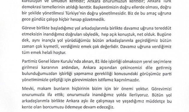 "Partimiz Genel İdare Kurulunda alınan, 81 ilde iş birliği olmaksızın yerel seçimlere girilmesi kararının ardından, Ankara açısından çekincemizi dile getirmiş bulunduğumuzdan işbirliği yapmamız gerekliliği konusundaki görüşümüz parti yönetimimizle çeliştiği için görevimizden istifamız kaçınılmazdır. 29 Ocak 2023'te devraldığım İYİ Parti Ankara İl Başkanlığı görevimden bugün itibarıyla istifa ettiğimi kamuoyuna saygılarımla duyururum."