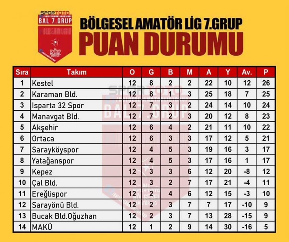 Temsilcimiz Karaman Belediyespor, Burdur Mehmet Akif Ersoy Üniversitesi Gençlik ve Spor'u deplasmanda 3-0 yendi.Bölgesel Amatör Lig (BAL) 7. grupta bu hafta sonu 12. hafta karşılaşmaları oynandı.Pazar günü saat 14.00'de Burdur Gazi Atatürk Stadında oynanan mücadeleyi Samet Şahin yönetti.Maç ilk yarısı 0-0 sona erdi. Maçın ikinci yarısında Karaman Belediyespor'a galibiyeti getiren ilk golü 51. dakikada penaltıdan Muzaffer İlhan ve 60. dakikada Tugay Tiryaki kaydetti. Dakikalar 84'ü gösterdiğinde Barış Civelek'in golü ile Karaman Belediyespor 3-0 öne geçti.Maç bu şekilde tamamlanırken temsilcimiz sahadan 3-0 galip ayrıldı. Temsilcimiz Karaman Belediyespor deplasmanda aldığı galibiyetle puanını 25’e yükselterek ligde 2.sıraya yerleşti.Karaman Belediyespor 26 puanla lig lideri Kestel Spor ile puan farkını 1'e indirmiş oldu. MAÇ SONUÇLARIÇal Bldspor 4-2 YatağansporKepez Bldspor 3-1 Bucak Bld OğuzhansporManavgat Bldspor 0-1 EreğlisporAkşehirspor 2-2 KestelsporSarayönü Bldspor 1-4 Isparta 32 SporOrtaca Bldspor 1-1 SarayköysporMakü 0-3 Karaman Bldspor