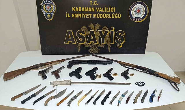 Karaman'da asayiş uygulamalarında uyuşturucu, bıçaklar ve ruhsatsız silahlar ele geçirilirken, çeşitli suçlardan aranan 4 şahıs tutuklandı.