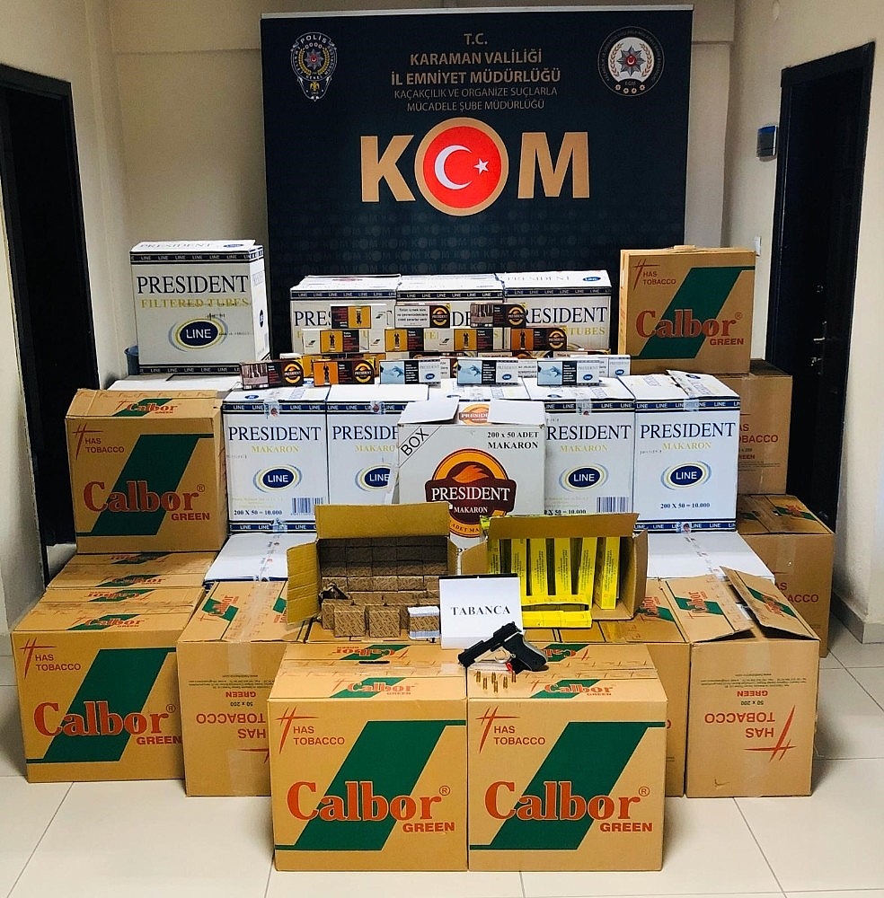 Alınan bilgiye göre, Karaman Emniyet Müdürlüğü, Kaçakçılık ve Organize Suçlarla Mücadele Şubesi ekipleri, Z.B. ve M.Y isimli şahısların kaçak sigara sattığı yönünde duyum alması üzerine çalışma başlattı. Ekiplerce şahıslar gözaltına alınırken, yapılan aramada 3 bin 15 adet kaçak tütün sarma kağıdı, 390 bin boş sigara makaronu ve ruhsatsız tabanca ele geçirdi.
