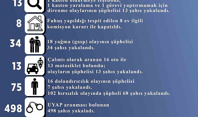 Kayseri İl Emniyet Müdürlüğü Asayiş Şube Müdürlüğü ekipleri tarafından Eylül ayında yapılan çalışmalarda fuhuş yapıldığı tespit edilen 8 ev komisyon kararı ile kapatıldı. Ekipler tarafından yapılan çalışmalarda 4 kasten öldürme, 1 kasten öldürmeye teşebbüs, 1 kasten yaralama ve 1 görevi yaptırmamak için direnme olaylarının şüphelisi 13 şahısla birlikte, 16 dolandırıcılık olayının şüphelisi 7 şahıs da yakalandı.