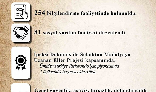 Edinilen bilgiye göre; Toplum Destekli Polislik Şube Müdürlüğü ekiplerince 1-30 Eylül tarihleri arasındaki 254 bilgilendirme faaliyetinde bulunuldu, 81 sosyal yardım faaliyeti düzenledi, İpeksi Dokunuş ile Sokaktan Madalyaya Uzanan Eller Projesi çerçevesinde Ümitler Türkiye Taekwondo Şampiyonasında; 1 üçüncülük başarısı elde edildi.