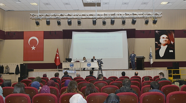 Daha sonra KMÜ İslami İlimler Fakültesi Dr. Öğr. Üyesi Mesut Can ‘İnsan Hakları ve İslam’ konulu sunumunu yaptı. İnsan hakları konusunu Cahiliye dönemi ve İslam sonrası dönem olarak ele alacağını ifade eden Can, Cahiliye döneminin genel durumunu kabile anlayışı, hür-köle ayırımı ve kadın ile çocukların durumu bağlamında açıklayarak, "Bu dönemde kabilesi güçlü olanın olmayana, hür olanın köleye karşı üstünlüğü vardı." dedi. Cahiliye döneminde kadınlara herhangi bir hak tanınmazken İslam sonrası bu durumun değiştiğini söyleyen Can, "Nisa Suresinde kadın haklarının anlatıldığı hükümlerin var olması bunun kanıtıdır." şeklinde konuştu. Can, ayrıca Medine'de İslam ile birlikte kabilecilikten topluma geçildiğini, kardeşleştirme kapsamında toplumsal eşitlik ve sosyal dayanışmanın tesis edildiğini, Medine Sözleşmesi ile de çoğulculuğun benimsendiğini ifade ederek "Medine Sözleşmesinin en önemli yapı taşı güven sözüdür." açıklamasında bulundu. Veda Hutbesine de değinen Can, "Peygamber Efendimiz metnin başından sonuna kadar İslam alemi diye değil, ey insanlar diye seslenmiş; çağları aşan bir emirle insanların birbirlerinin hak ve hukuklarına dikkat etmeleri gerektiğine dikkat çekmiştir." dedi.