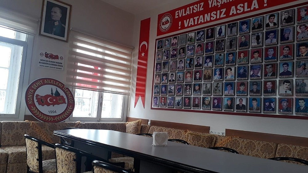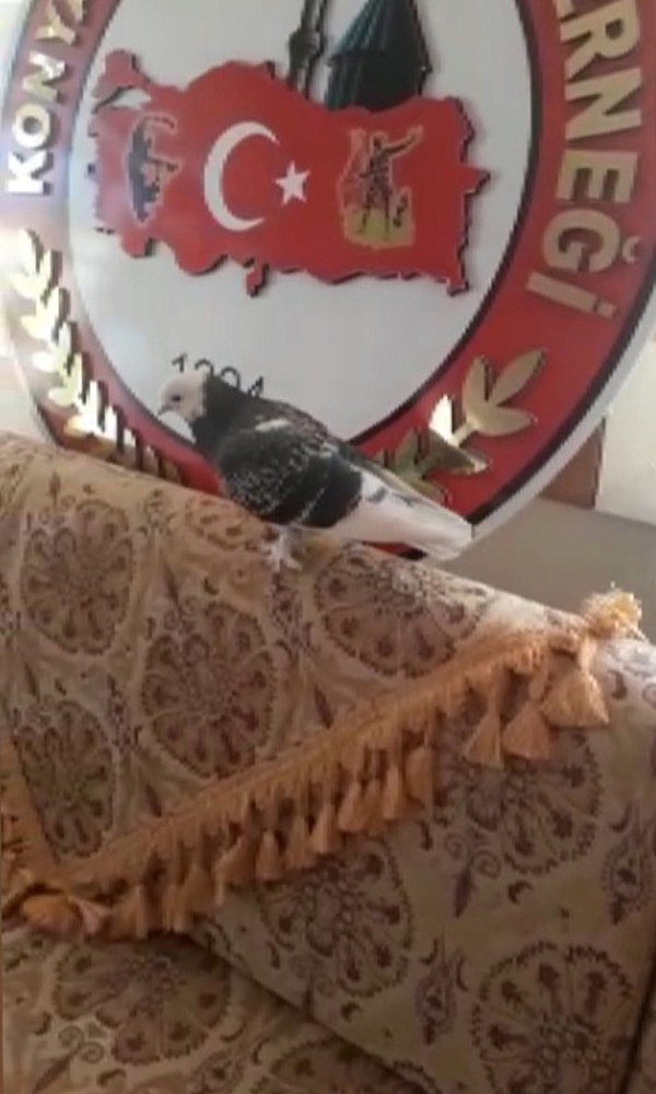 Konya'da Şehit Aileleri Derneğinde pencereden içeriye girerek şehitlerin fotoğraflarının bulunduğu odaya giden paçalı güvercin görenleri duygulandırdı.