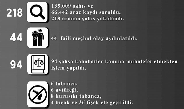 Edinilen bilgiye göre; Melikgazi İlçe Emniyet Müdürlüğünce 1-30 Eylül tarihleri arasında yapılan çalışmalarda; 135 bin 9 şahıs ve 66 bin 442 araç kaydı soruldu. Çalışmalarda; 218 aranan şahıs yakalanırken 44 faili meçhul olay da aydınlatıldı. Ayrıca 94 şahsa da kabahatler kanuna muhalefet etmekten işlem yapıldı.