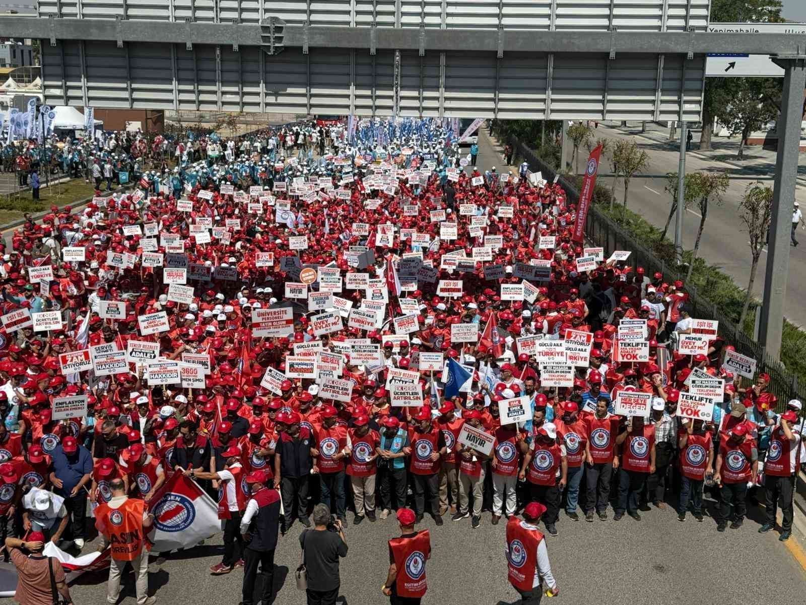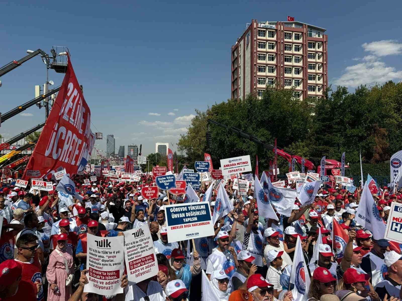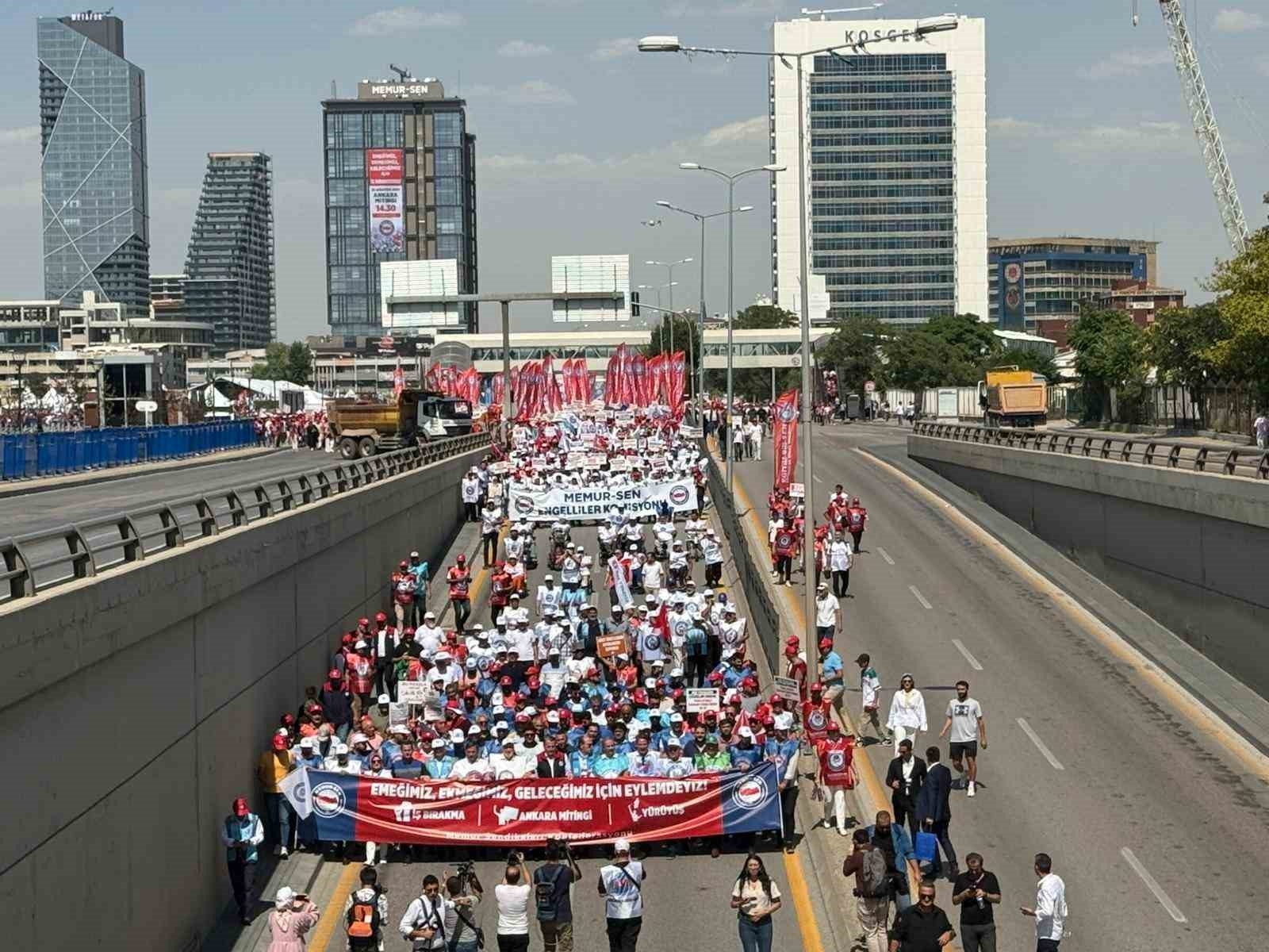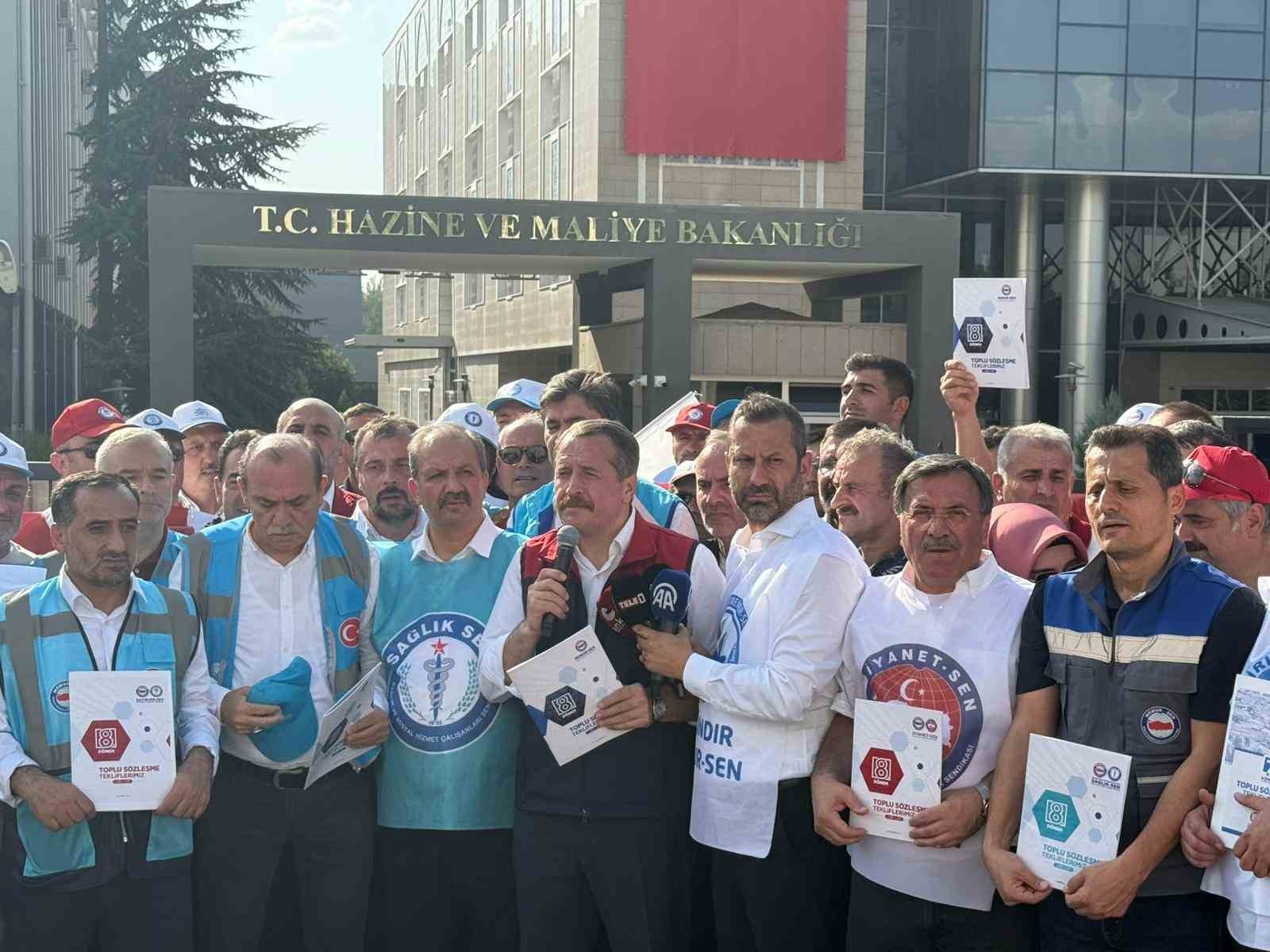 Memur Sendikaları Konfederasyonu (Memur-Sen) üyeleri, bir günlük iş bırakma kararının ardından düzenlenen eylemde Hazine ve Maliye Bakanlığına yürüdü. Kamuda yaklaşık 4 milyon memur ve 2 buçuk milyon memur emeklisini kapsayan 8'inci Dönem Toplu Sözleşme görüşmeleri devam ederken, Memur-Sen bir günlük iş bırakma kararının ardından sendika üyelerini Ankara'da Anadolu Meydanı'na davet etti. Düzenlenen yürüyüş öncesi bir konuşma yapan Memur-Sen Genel Başkanı Ali Yalçın, son olarak enflasyon farkı kadar zam verileceğinin açıklandığını belirterek, "Sunulan rakamları yetersiz bulduk, reddettik. Dedik ki böyle teklif olmaz, bu teklifle pazarlık-mazarlık yapılmaz. Daha sonra taban aylığa bin lira zam önerdiler, yöntem doğru ama rakam yanlış dedik. Bin liraya memur cebindeki hangi deliği kapatsın? O paraya market filesinin yarısı bile dolmaz. Biz, refah payı istiyoruz. Çünkü geçmiş dönem kayıplarımız var. Taban aylığa sembolik bir dokunuş değil, adam gibi artış istiyoruz. Çünkü görev aylığı ile emekli aylığı arasındaki bağ koptu. Maaşlarımıza oransal zam istiyoruz. Çünkü çalışanların alım gücü düştü, yoksulluk sınırının altına demir attı. Gelir Vergisi'nin yüzde 15'e sabitlenmesini istiyoruz. Çünkü kaşıkla verilen zam kepçeyle geri alınıyor. Hükümet, bütün bunları sağlayacak adil bir teklifle gelsin. Masada uzlaşı, sahada bayram olsun diyoruz. Biz sadaka istemiyoruz, biz emekliye, memura nefes aldıracak bir rakam bekliyoruz" ifadelerini kullandı. Meydanda yaptığı konuşmanın ardından Yalçın, Memur-Sen'e bağlı sendika başkanları ile Hazine ve Maliye Bakanlığı'na yürüdü. Yalçın, Hazine ve Maliye Bakanlığı önünde yaptığı açıklamada 8'inci Dönem Toplu Sözleşme için sundukları teklifin üzerinden 26 gün geçtiğini dile getirerek, bu süre içinde tekliflerin değerlendirilmesi, ön müzakere, ara müzakere gibi süreç yönetimi ile masada oyalandıklarını söyledi. Konuşmasının ardından Bakanlık binasına giren Yalçın, birçok iş kolunun tekliflerini içeren kitapçıkları yetkililere sundu.