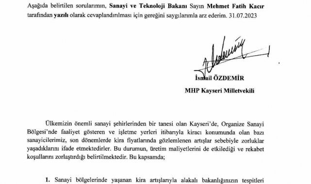 Milliyetçi Hareket Partisi (MHP) Genel Başkan Yardımcısı ve Kayseri Milletvekili İsmail Özdemir, kentte sanayi bölgelerinde yaşanan kira artışına ilişkin Sanayi ve Teknoloji Bakanı Mehmet Fatih Kacır'a verdiği soru önergesinde sanayi tesislerinde fahiş kira artışının önüne geçilmesi için alınacak tedbirleri sordu.