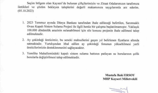 "Tarım ve Orman Bakanımız Sayın İbrahim Yumaklı'yı ziyaret ederek, Kayserili çiftçilerimizin taleplerini ilettik. 2023 Temmuz ayında Dünya Bankası tarafından ihale edileceği belirtilen, Sarımsaklı Ovası Kapalı Sistem Sulama Projesi ile ilgili henüz bir çalışma başlatılmamıştır. Yaklaşık 100 bin dönümlük arazinin sulanabilmesi için söz konusu projenin ihale edilmesi talep edilmektedir. Ay çekirdeği üreticimiz, bu seneki mahsullerini geçen yıl belirlenen fiyatların altında satmaktadır. Yurtdışından ithal edilen ay çekirdeği fonunun yükseltilmesi yerli üreticilerimizin desteklenmesini sağlayacaktır.Yemliha Mahallemizdeki kapalı sistem sulama hattının patlayan su borularının çelik borularla değiştirilmesi talep edilmektedir."