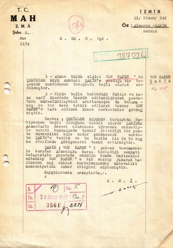 Milli İstihbarat Teşkilatı (MİT), özel koleksiyonunda yer alan "İngiliz Kemal" hakkında görüş bildiren raporlar ve dönemin Almanya'nın Ankara Büyükelçisi Franz Von Papen'in uğradığı suikasttan sonra gönderilen tebrik mektupları ve belgeleri içeren bir bölümü paylaştı.
