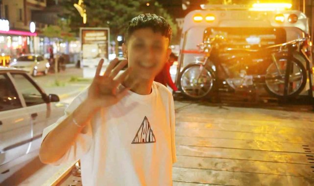 Aksaray'da farı yanmadığı için motosikleti trafikten men edilen genç sürücü motosikletini kendi elleriyle çekiciye yükleyip kendisini görüntüleyen basın mensuplarına da el salladı.
