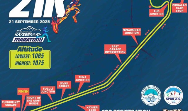 21 Eylül 2025'te koşulacak 5'inci Uluslararası Kayseri Yarı Maratonu 21K, 10K ve Halk Koşusu parkurlarında gerçekleşecek. Sporcular 21K parkurunda Ordu Evi önü start noktasından koşuya başlayarak Sivas Caddesi boyunca devam edip Cırgalan Tramvay Durağından Anadolu Harikalar Diyarı (AHD) Kavşağına dönecek ve ardından şehir merkezi yönünde Mimar Sinan Kavşağı, Doğu Garajı Kavşağı, Tuna Kavşağı ve Fuzuli Kavşağı'nı geçerek Ordu Evi önü bitiş çizgisine ulaşacak.