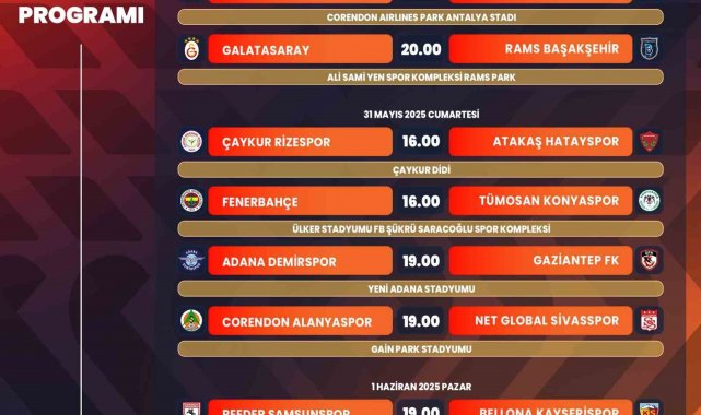 Süper Lig'de 38. hafta maç programı belli oldu. Kayserispor, sezonun son maçını 1 Haziran Pazar günü oynayacak.