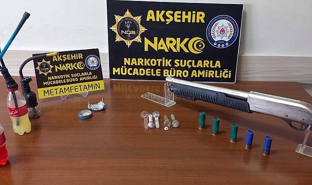 Akşehir İlçe Emniyet Müdürlüğü Narkotik Suçlarla Mücadele Büro Amirliği ekipleri gençleri zehirlemek için sokak satıcılığı yapan şahıslarla ilgili çalışmalarını aralıksız sürdürüyor. Narkotik ekipleri Samsun plakalı bir araçta uyuşturucu madde ile silah olduğu yönünde yapılan ihbarı değerlendirerek aracı Konya Afyonkarahisar Kara yolu üzerinde yakaladı. Araçta bulunan H.H.A. isimli şüpheli şahıs gözaltına alınırken, araç da İlçe Emniyet Müdürlüğü bahçesine getirildi. Narkotik ekibi Akşehir Cumhuriyet Başsavcılığından alınan arama kararı ile araçta ve şüphelinin üzerinde arama yaptı. Yapılan aramada 2 gram metamfetamin uyuşturucu madde ile 8 adet uyuşturucu kullanma aparatı bong, 1 adet av tüfeği ve 5 adet fişek ele geçirildi. Gözaltına alınan H.H.A. isimli şüpheli hakkında "Uyuşturucu Madde Bulundurmak ve Kullanmak, 6136 Sayılı Kanuna Muhalefet suçlarından işlem yapıldı.