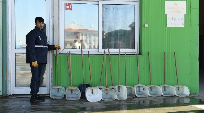 Görevli personel tarafından, bidonlar spiral ile ortadan kesilip sap takılmasıyla birlikte ekstra bir ücret ödemeden faraşa dönüştürülüp temizlik hizmetlerinde kullanılmak üzere ekiplere dağıtılıyor.