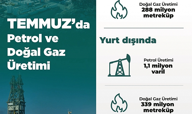 Temmuz ayında Türkiye genelindeki sahalarda toplam petrol üretimi 4 milyon varil olurken aynı dönemde doğal gaz üretimi ise toplam 288 milyon metreküp olarak gerçekleşti.