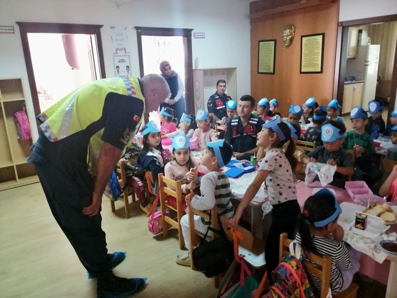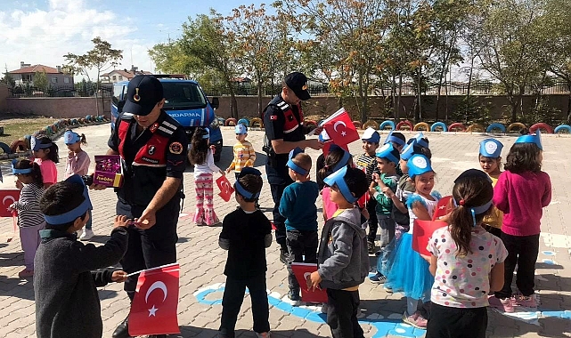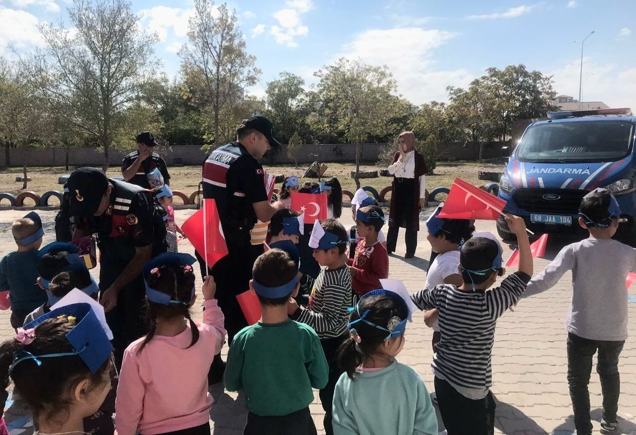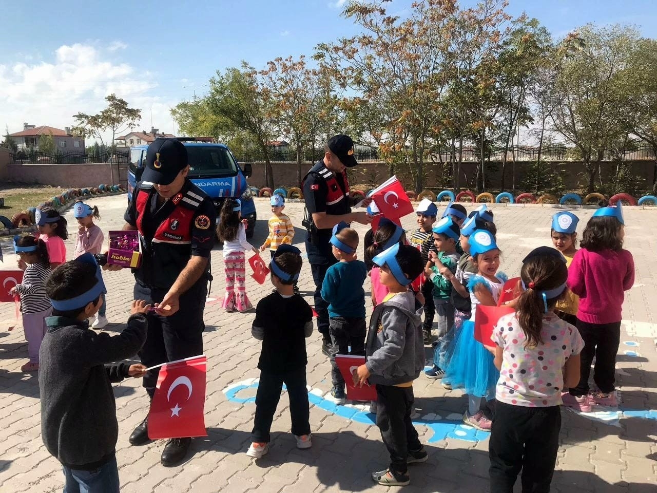 Aksaray'da İl Jandarma Komutanlığı Trafik Şubesi Ekipleri okulların açılmasıyla birlikte minik öğrencilere trafik eğitimi verdi.