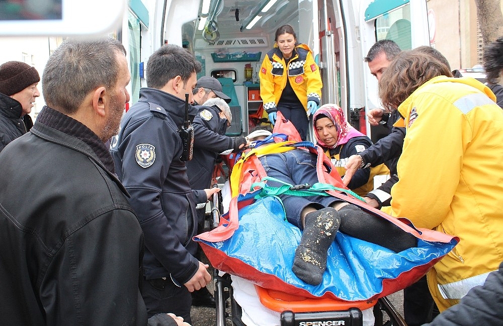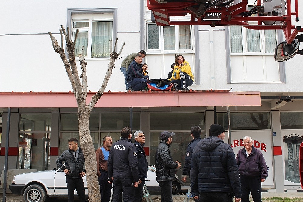 İtfaiye tarafından sedyeyle aşağıya indirilen yaralı hastaneye kaldırıldı.